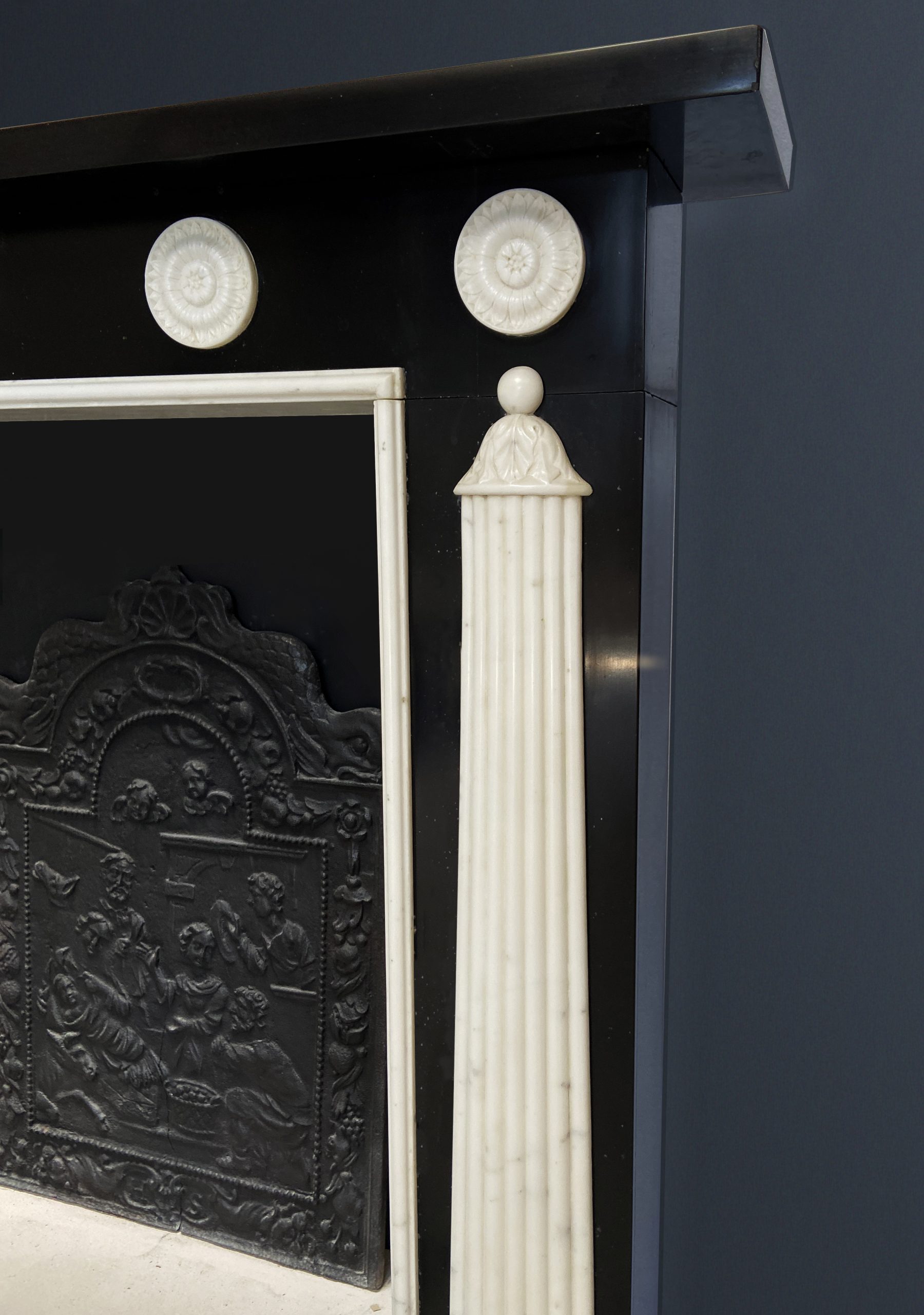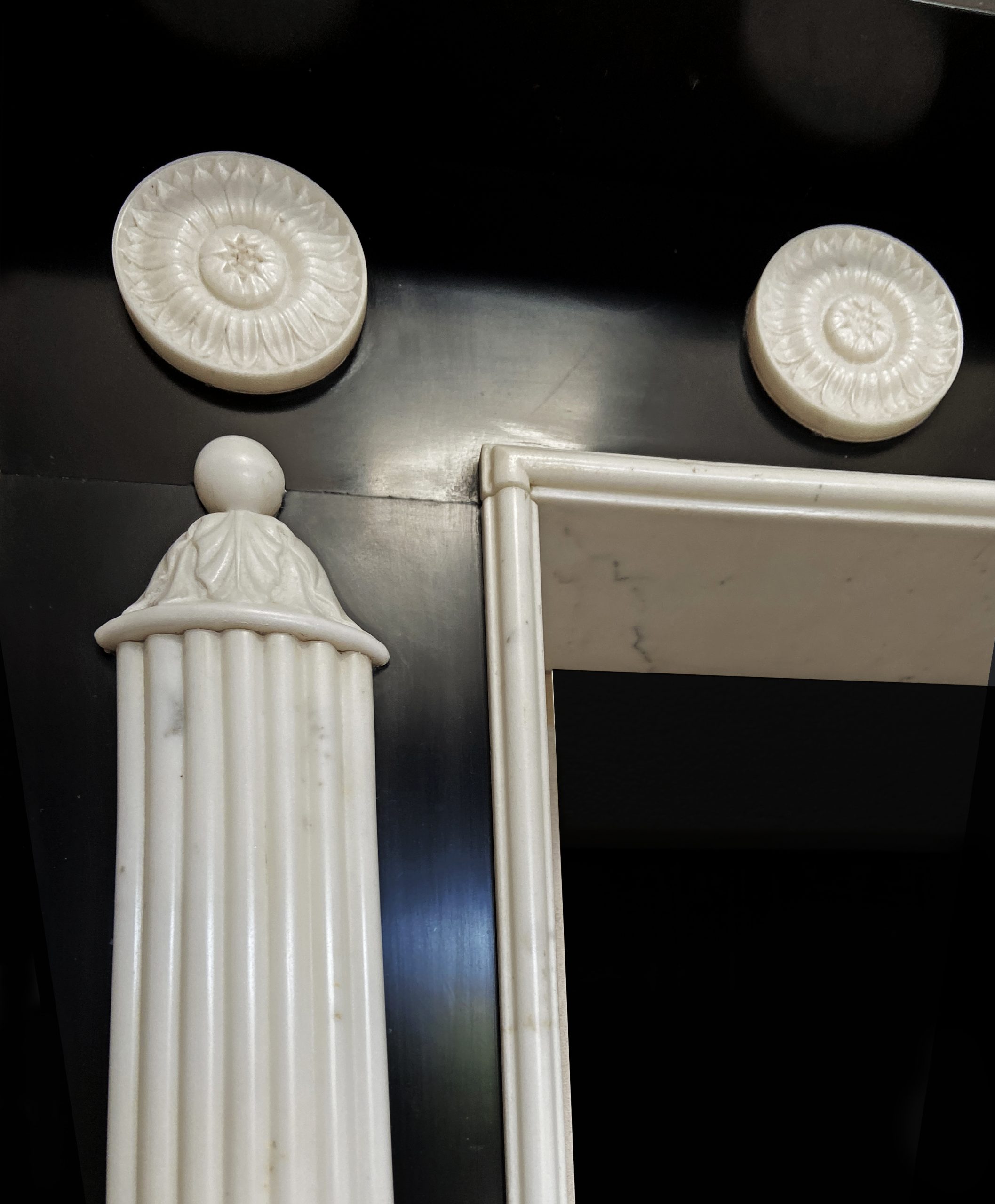 Modern Derbyshire black and statuary marble chimney-piece in the Regency manner.